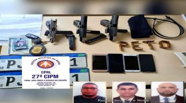 Foram apreendidos com os suspeitos; três pistolas calibre 380, setenta e três cartuchos, cinco carregadores, dois veículos sendo um FORD K, placa PJP-9611, e um VECTRA, placa CYY 0B09, usado pelos bandidos, um par de placas MERCOSUL, quatro aparelhos celulares, dois lacres e uma balaclava.