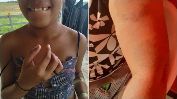 Esposa do vaqueiro Paulo, alega que teve dente quebrado devido as agressões sofrida na abordagem policial, cigana mostra o braço machucado com cabo de vassoura e também a cabeça segundo ela pela ação da policia.