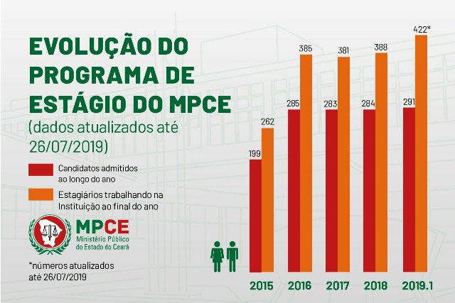 O investimento do Ministério Público do Estado do Ceará (MPCE) no programa de estágio dobrou nos últimos cinco anos. Segundo dados do Núcleo Gestor de Estágio (Nuge), em 2015, cerca de R$ 2,4 milhões foram investidos no programa, entre pagamento de bolsa, auxílio-transporte e seguro contra acidentes pessoais. Para este ano, o valor orçado chega a R$ 5 milhões, um crescimento de 107% em relação aos valores investidos há cinco anos. O número de estagiários remunerados também aumentou em 62%, passando de 262, em 2015, para 422, em 2019.