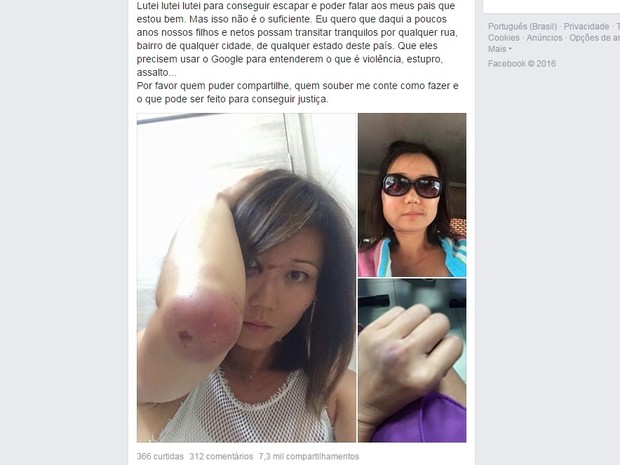 Depois disso, ela falou que pediu ajuda a um homem que passeava com cães, conseguiu gelo para tratar as agressões e, então foi atendida pela polícia, que a levou para prestar depoimento, fazer exames e reconhecer o suspeito preso. “Agradeço a cada instante por estar viva e não ter sido estuprada. A gente nunca pensa que pode acontecer com a gente, mas acontece. Quase aconteceu comigo e posso dizer que foi a pior sensação que já senti”, disse.