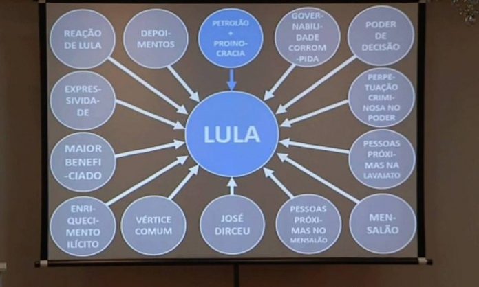 A ação de reparação de danos penais pede a condenação de Dallagnol. Durante apresentação feita para a imprensa, Dallagnol mostrou um gráfico com o nome do ex-presidente no centro cercado por setas e palavras como “petrolão”, “propinocracia”,