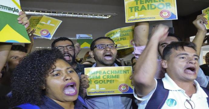 Um grupo de manifestantes protestou hoje (4) no Senado contra o impeachment da presidenta Dilma Rousseff. Com cartazes classificando o processo de “golpe” e o vice-presidente da República, Michel Temer, de “traidor”, os manifestantes ficaram próximos à sala da Comissão Especial do Impeachment, onde o relator, Antonio Anastasia (PSDB-MG), lê seu parecer favorável à abertura do processo.