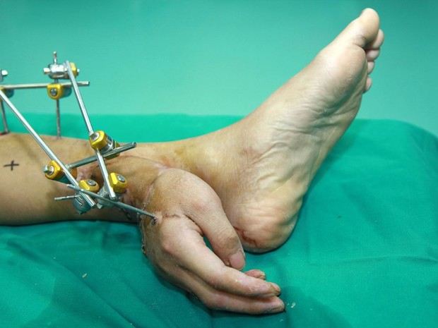 Lá, eles decidiram implantar o membro no tornozelo do paciente enquanto tratavam seus outros ferimentos, até terem condições de colocá-lo no lugar certo.