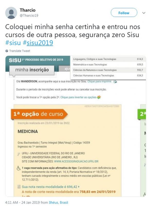 Candidatos tiveram dificuldade para concluir a inscrição e alterar as opções de curso já feitas – o sistema não carregava e, quando abria, exibia uma tela de login com problemas. Além disso, alguns participantes relataram que, mesmo digitando o número de inscrição e a senha corretos, foram levados a páginas de usuários desconhecidos.