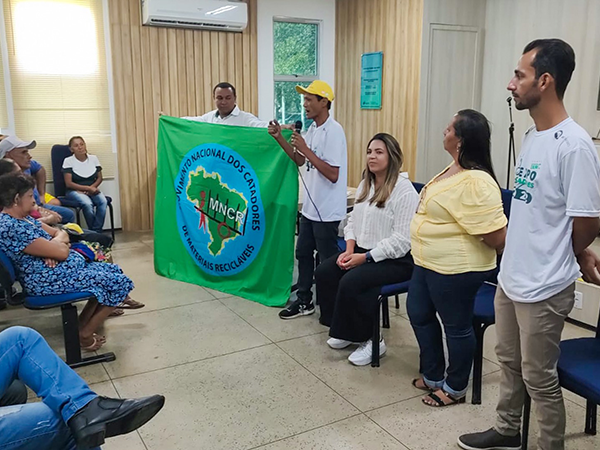 1. Marcílio – Secretário de Meio Ambiente de Várzea Alegre, Alan Jorge – Presidente da ASCMARVA – Associação de Catadores de Materiais Recicláveis de Várzea Alegre e integrantes da associação, Livânia de Sousa – coordenadora da Coleta Seletiva do município, e André Wirtzbiki – Superintendente do Consórcio Público de Manejo de Resíduos Sólidos da Região Sertão Centro Sul participaram dessa reunião.
