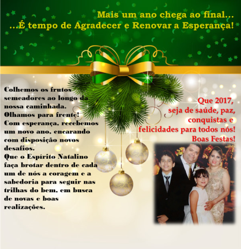 Que o ano de 2017 venha repleto de luz e bênçãos na certeza de mais um ano de trabalho e dedicação e que tenhamos um ano de muita prosperidade, de muita chuva. Sejamos perseverantes, vamos transformar as nossas fraquezas em força, buscando sempre o amparo e a graça de Deus, nosso poderoso Pai. Que Jesus esteja presente nos lares de todas as famílias e nos abençoe.