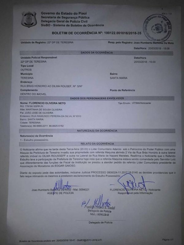 A vítima registrou Boletim de Ocorrência nº 100122.001016/2018-35, no 22º DP de Teresina, o delegado Franklin Riedel, fará investigação de possível existência de associação criminosa para invasão de terrenos.