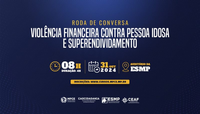 O MP do Ceará promoverá um evento sobre proteção dos direitos das pessoas idosas, incluindo o enfrentamento da violência financeira e do superendividamento, no dia 31 de outubro, das 8h às 12h, no auditório da Escola Superior do Ministério Público, em Fortaleza. Com carga horária de 4h/a, a palestra será realizada em formato de roda de conversa, ou seja, os palestrantes conversarão simultaneamente sobre o tema. Os interessados devem se inscrever na plataforma de cursos da ESMP/Ceaf.