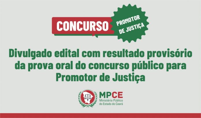 O Ministério Público do Estado do Ceará (MPCE) torna público, nesta terça-feira (5), o resultado provisório na prova oral, por meio do Edital nº 026/2022, referente ao concurso público para o provimento de vagas e a formação de cadastro de reserva no cargo de Promotor de Justiça de Entrância Inicial da Carreira do Ministério Público do Estado do Ceará.