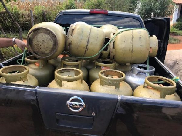 Foi flagrado comércio clandestino de GLP, com apreensão de 30 botijões, sendo 8 cheios e 22 vazios.