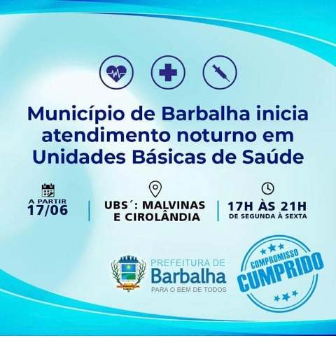 A Prefeitura de Barbalha inicia nesta segunda-feira, (17/6), o horário de funcionamento noturno das Unidades Básicas de Saúde dos Bairros Malvinas e Cirolândia.