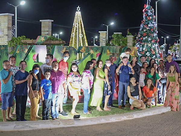 O prefeito Zé Helder (MDB), a primeira-dama Sônia Fortaleza e servidores da Secretaria Municipal de Cultura e Turismo acionaram a iluminação natalina da cidade no Parque Cívico São Raimundo Nonato.