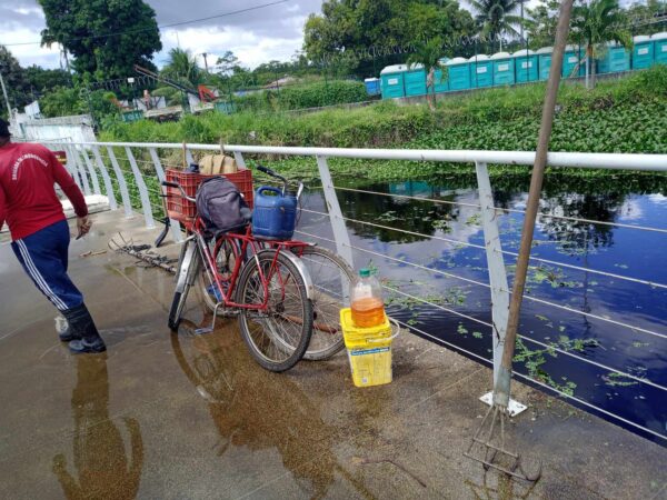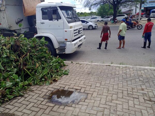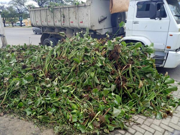 Na lagoa a superfície está toda coberta por aguapés. As plantas estão tão densas que a limpeza está sendo braçal por uma equipe, e colocada em um caminhão para o descarte correto.