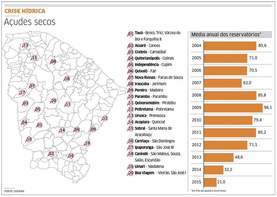 Terminada a quadra invernosa de 2015 (fevereiro a maio), os reservatórios acumulavam em média 21%, segundo dados do Gerenciamento de Recursos Hídricos da Cogerh. O atual período de seca, iniciado em 2012, é o mais longo desde 1973, segundo estudos da Fundação Cearense de Meteorologia e Recursos Hídricos (Funceme).