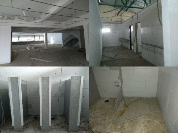 O prédio abandonado, depredado, com algumas pichações e alvo de furtos de vários objetos como pias, vasos sanitários, portas, janelas, grades, alambrados bancada e paredes de mármores, fiação, lâmpadas, forro pvc entre outros.