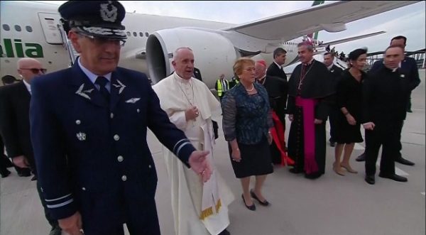 O Papa Francisco chegou à noite desta segunda-feira (15/01) ao Chile, onde fará uma visita de três dias. O Papa foi recebido pela presidente Michelle Bachelet e três crianças, que lhe entregaram flores, assim como membros da Igreja e outras autoridades. O forte vento levou Francisco a tirar o solidéu ao desembarcar do avião.