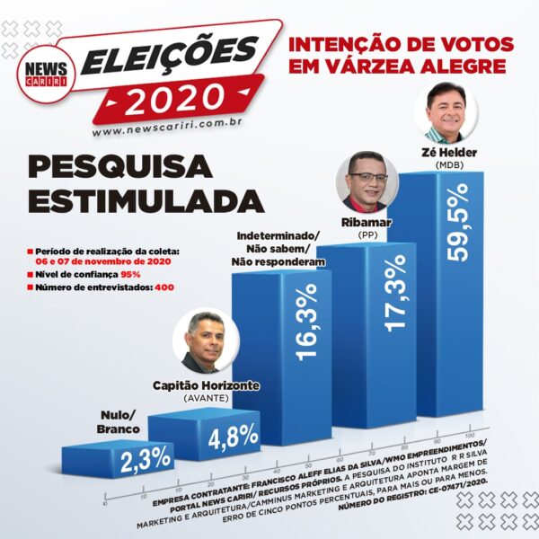 Em Várzea Alegre na corrida eleitoral pelo comando da prefeitura da cidade, o candidato Zé Helder (MDB), da coligação a “Mudança Continua” está na frente com 59,5% da preferência dos eleitores para vencer as eleições.