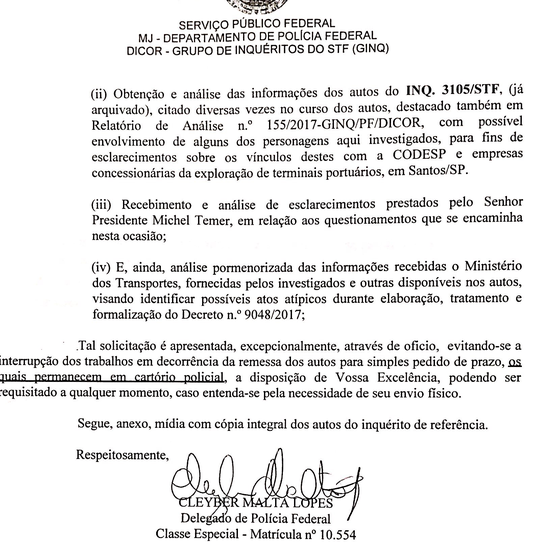 O delegado da Polícia Federal Cleyber Lopes, encarregado da investigação contra o presidente Michel Temer no chamado inquérito dos portos, pediu ao ministro Roberto Barroso para ter acesso a informações de outra investigação que tramitou no Supremo Tribunal Federal (STF) para apurar o envolvimento do emedebista em pagamento de propina na área portuária. O inquérito foi arquivado em 2011 pelo ministro Marco Aurélio Mello, a pedido do ex-procurador-geral da República Roberto Gurgel. No curso da atual apuração, aberta a partir da delação premiada de executivos do grupo J&F, a PF reuniu elementos que indicaram a necessidade de analisar o material colhido anteriormente.