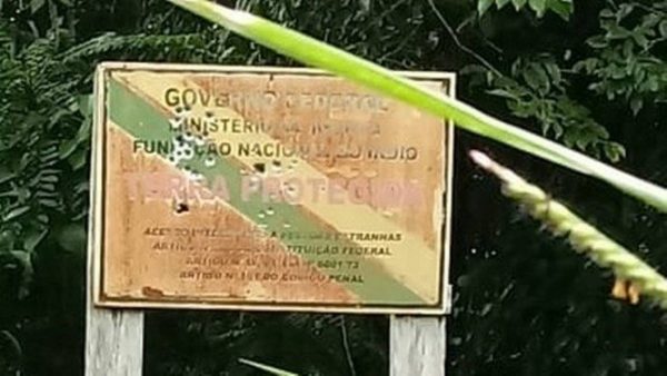 A equipe da Funai tirou a foto de uma placa da terra dos Uru-Eu-Wau-Wau, com marcas de bala. Devido ao risco que os posseiros representam, Franklimberg quer o apoio da Polícia Federal.
