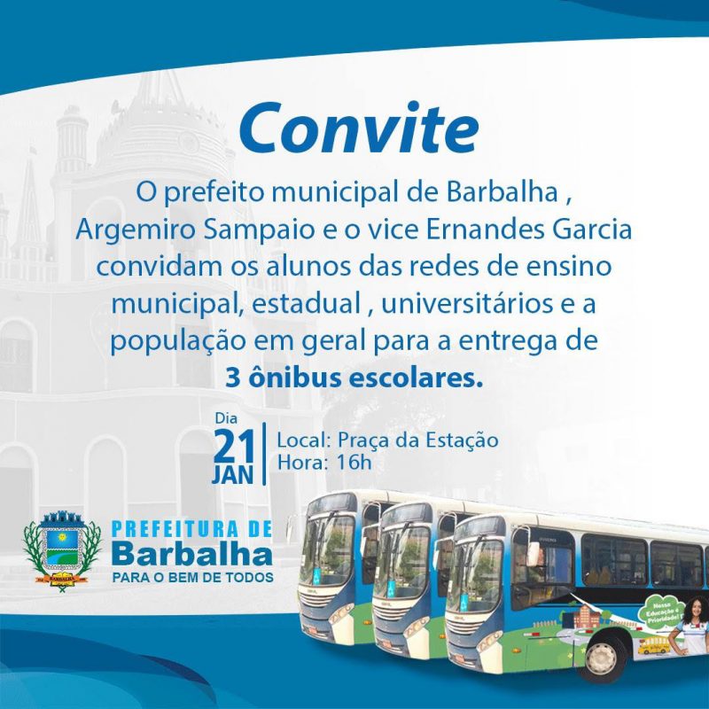 O prefeito de Barbalha, Argemiro Sampaio Neto, vai entregar três ônibus escolares aos estudantes do município. A entrega deve acontecer nesta terça-feira, 21, na Praça Engenheiro Dória (Praça da Estação). Os veículos foram adquiridos com recursos próprios e devem contemplar, além dos alunos da rede municipal de ensino, os universitários residentes em Barbalha que estudam em cidades vizinhas.