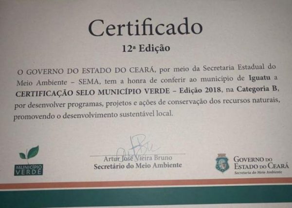 Segundo o secretário de Meio Ambiente de Iguatu, Marcos Ageu, o Selo Município Verde é um Programa de Certificação Ambiental Pública que identifica a cada dois anos os municípios cearenses que desenvolveram ações protetivas do meio ambiente com melhores resultados na salvaguarda ambiental, atendendo a critérios de conservação e uso sustentável dos recursos naturais.