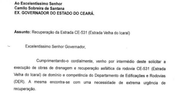 Naumi afirma no documento que “a rodovia encontra-se com uma necessidade de extrema urgência de recuperação”. E completa: “Confiante no elevado espírito público do senhor, apresento-lhe, em nome do povo de Caucaia, protesto de elevada estima e apreço.”