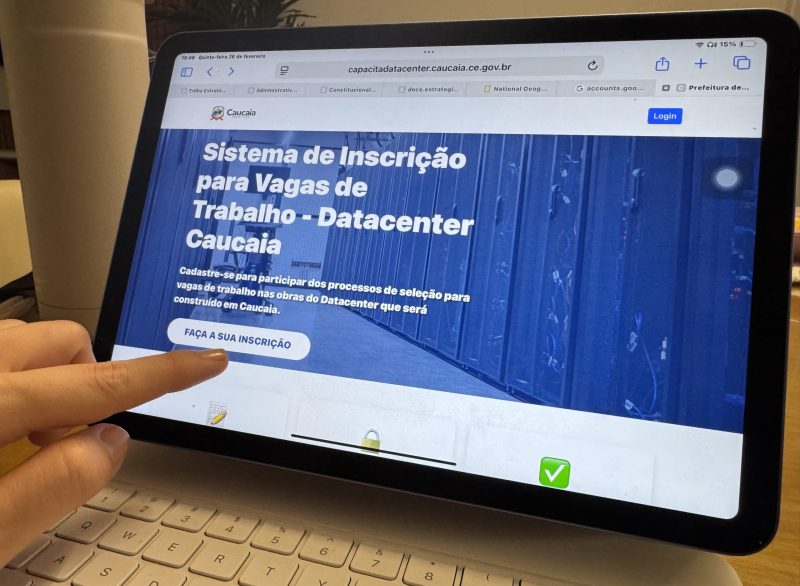O espaço digital permitirá que os interessados realizem cadastro e tenham acesso às vagas disponíveis, facilitando a conexão entre a empresa responsável pela obra e os trabalhadores do município. Para se candidatar, o processo é simples: basta acessar https://capacitadatacenter.caucaia.ce.gov.br/, realizar o cadastro, escolher a vaga de interesse e anexar o currículo.