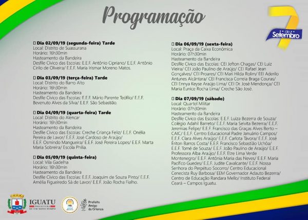 Horário: 07h30min Hasteamento da Bandeira Desfile Cívico das Escolas: E.E.F. Luiza Bezerra de Souza/ Colégio Adahil Barreto/ E.E.F. Maria Selvita Bezerra/ E.E.F. Jeremias Felipe/ E.E.F. Francisco das Graças Alves Berto – CAIC/ E.E.F. Centro Educacional Padre Januário Campos/ E.E.F. Clara Alves Araújo/ E.E.F. Carlota Távora/ E.E.F. José Ériton Barros Costa/ E.E.F. Francisco Sebastião Uchôa/ E.E.F. Tomé de Souza/ E.E.F. João Paulino de Araújo/ E.E.F. Professora Alba Araújo/ E.E.F. Elze Lima Verde Montenegro/ E.E.F. Antônia Maria das Neves/ E.E.F. Maria Pacífico Guedes/ E.E.F. Judite Cavalcante/ E.E.F. Nossa Senhora do Perpétuo Socorro/ Centro Educacional Cenecista Ruy Barbosa/ EEM Governador Adauto Bezerra/ Centro de Educação Randara Mello/ Instituto Federal Ceará – Campos Iguatu.