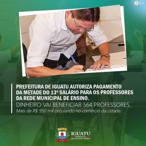 O prefeito de Iguatu, Ednaldo Lavor (PSD) através da administração de Um Novo Tempo, antecipou para hoje (22/7), o pagamento da primeira parcela do 13° salário para os professores da rede municipal de ensino. A decisão agradou de forma substancial a classe do magistério. “Serão mais de R$ 950 mil beneficiando 564 professores concursados”, disse Ednaldo.