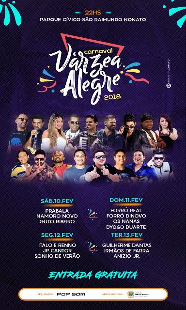 A empresa Pop Eventos, divulgou nesta quarta-feira, 24, as atrações do Carnaval de Várzea Alegre 2018. Se apresentarão no Parque Cívico São Raimundo: Prabalá, Namoro Novo, Guto Ribeiro, Forró Real, Forró DiNovo, Os Nanas, Dyogo Duarte, Ítalo e Renno, JP Cantor, Sonho de Verão, Guilherme Dantas, Irmãos de Farra e Anízio Jr.