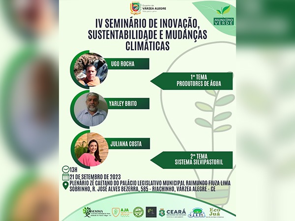 A Secretaria de Meio Ambiente de Várzea Alegre (SEMMA) realizará o IV Seminário de Inovação e Sustentabilidade e Mudanças Climáticas. O evento, marcado para quinta-feira, 21 de setembro, com início às 13h, acontecerá no Plenário Vereador José Caetano, na Câmara de Vereadores do município.