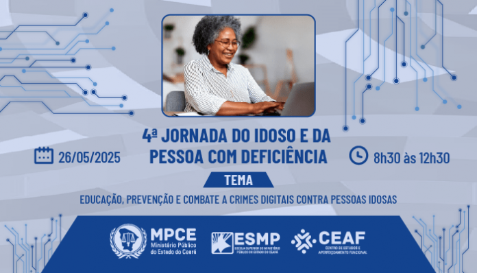 O Ministério Público do Estado do Ceará promoverá, no dia 26 de maio, das 8h30 às 12h30, a 4ª Jornada do Idoso e da Pessoa com Deficiência com o tema “Educação, prevenção e combate a crimes digitais contra pessoas idosas.”. O evento, aberto ao público, ocorrerá no auditório da Escola Superior do Ministério Público (ESMP), em Fortaleza. Interessados devem se inscrever na plataforma da ESMP/Ceaf (https://cursos.mpce.mp.br/).