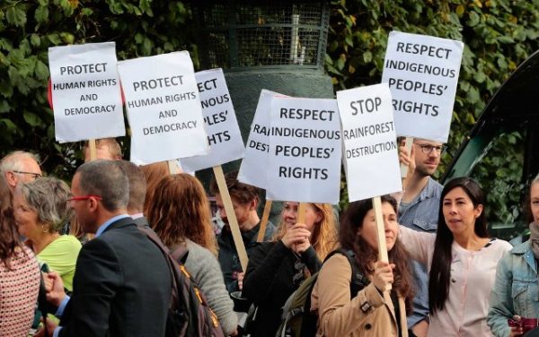 Um grupo fez uma manifestação em Oslo, na frente do prédio onde Temer e Erna se reuniram, exibindo cartazes pedindo respeito à democracia, aos direitos humanos e aos direitos indígenas.
