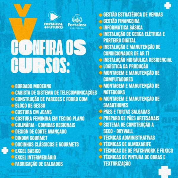 No momento, o Fortaleza + Futuro está ofertando cursos em áreas como moda, gastronomia, saúde, beleza, gestão e tecnologia da informação. As capacitações serão realizadas em turmas com modalidades presenciais. Os interessados devem apresentar documento oficial com foto (RG), CPF, comprovante de escolaridade e de residência. Os cursos são destinados para moradores de Fortaleza a partir dos 16 anos. Além da documentação, é necessário seguir alguns requisitos que mudam de acordo com o curso escolhido.