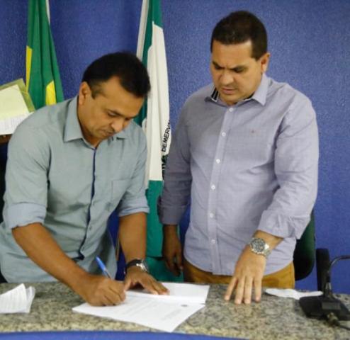 O secretário Fábio Abreu juntamente com o prefeito de Demerval, Lobão Junior Carvalho (PMDB) assinaram o Termo de Cooperação Técnica Mirim Cidadão.