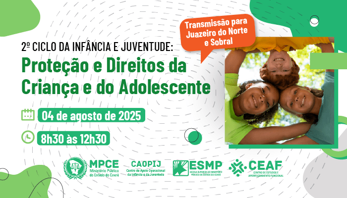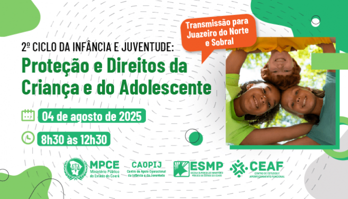 O Ministério Público do Estado do Ceará realizará, no dia 04 de agosto, das 8h30 às 12h30, o 2º Ciclo da Infância e da Juventude, que terá como tema “Proteção e Direitos da Criança e do Adolescente”. O evento é aberto ao público e ocorrerá, presencialmente, no auditório da Escola Superior do Ministério Público (ESMP), em Fortaleza, com transmissão para as sedes regionais da Escola em Juazeiro do Norte e Sobral. Para participar e receber o certificado de 4 h/a, os interessados devem se inscrever previamente na plataforma de cursos e eventos da ESMP/Ceaf.