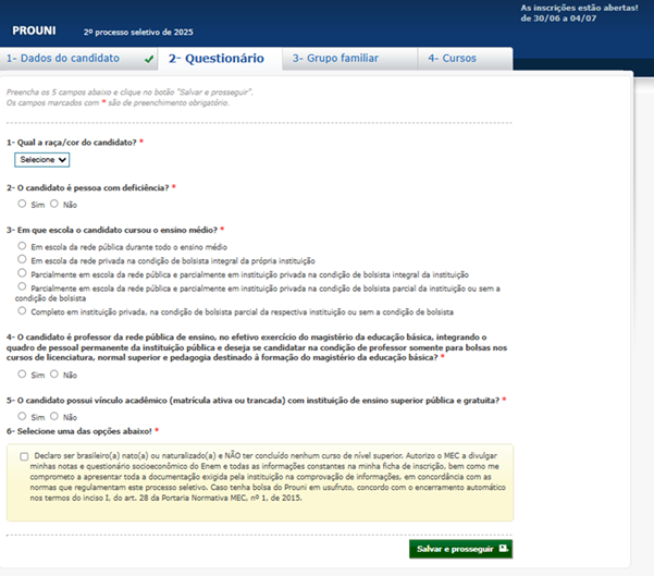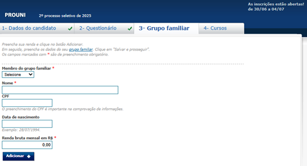 2º passo: informar seus dados, perfil socioeconômico e grupo familiar.