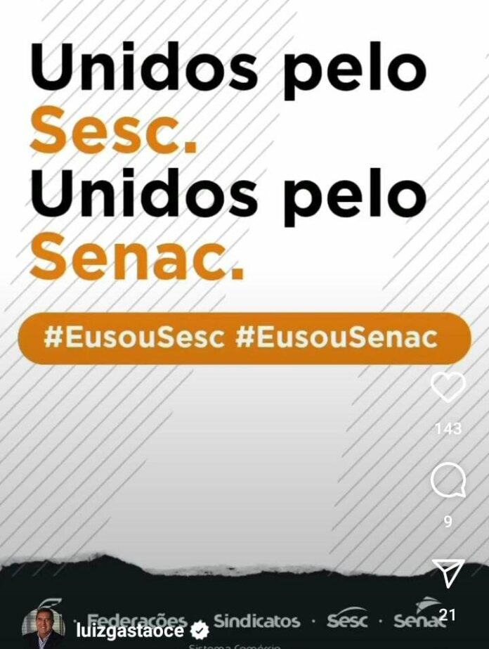 O Sistema Fecomércio Ceará participa do “Dia de S”, mobilização do Sistema CNC, Fecomercios, Sesc, Senac e sindicatos empregadores de todo o país para conscientizar a sociedade sobre o PLV 9/23, que pretende destinar 5% dos recursos do Serviço de Comércio Social (Sesc) e do Nacional Serviço de Aprendizagem Comercial (Senac) para financiar a Agência Brasileira de Promoção do Turismo Internacional (Embratur).