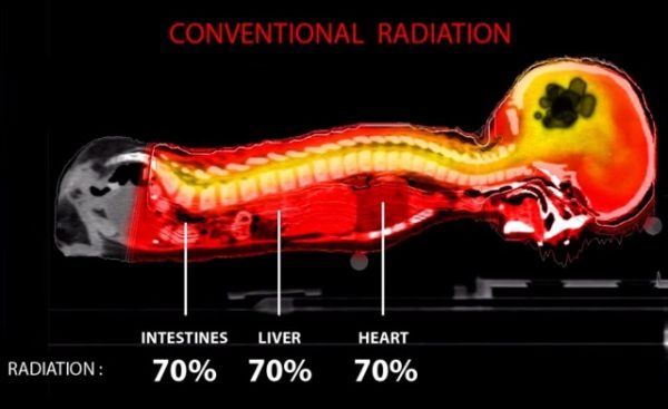 Esquema mostra a radiação recebida pelo intestino, fígado e coração no tratamento convencional de um meduloblastoma, câncer de cérebro comum em crianças . Segundo o especialista Arthur Rosa, a porcentagem de radiação recebida vai depender do tamanho da criança (Foto: Reprodução/Photo Beam Therapy )