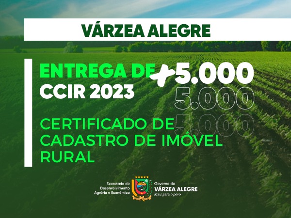 A Secretaria de Desenvolvimento Agrário e Econômico do Governo de Várzea Alegre realizará a entrega de mais de 5.000 Certificados de Cadastro de Imóvel Rural (CCIR) aos proprietários, após a medição de suas terras pelo Instituto do Desenvolvimento Agrário do Ceará (Idace).