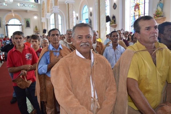 Os vaqueiros montados nos seus cavalos, vestidos de gibão, botas, coletes e chapéu de couro, acompanhavam atentos à missa, trazendo no semblante a bravura do homem sertanejo.