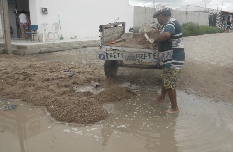 Sem ação do poder público: Comerciante “tapa-buraco” em rua do bairro Fomento.