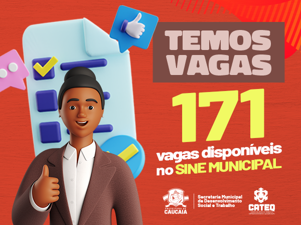 Semana começa com grandes oportunidades de emprego para o caucaiense. A Secretaria de Desenvolvimento Social e Trabalho (SDST), por meio do SINE, disponibiliza 171 novas vagas de emprego no município de Caucaia.