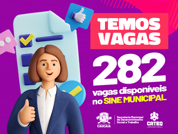 A Secretaria de Desenvolvimento Social e Trabalho (SDST), por meio do Sistema Nacional de Emprego (SINE), oferta 282 novas vagas de emprego no município de Caucaia. Há vagas para pessoas com deficiência (PCDs). Atendente de lojas e mercados (80 vagas), Motorista carreteiro (22 vagas), engenheiro de automação e controle (10 vagas), açougueiro (06 vagas), auxiliar de logística (03 vagas, PCD), conferente de mercadoria (04 vagas) são algumas das oportunidades disponíveis.são algumas das vagas disponibilizadas hoje.