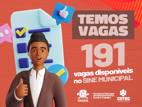 A quinta-feira (11) inicia com 191 vagas de emprego. Analista de logística, assistente de compras, auxiliar administrativo e atendente de telemarketing são algumas das vagas disponíveis. Para se candidatar, basta procurar o SINE Caucaia, localizado no prédio do Centro de Apoio ao Trabalho, Empreendedorismo e Qualificação (CATEQ), na rua 15 de novembro, 1478 – no Centro, das 08h às 16h.