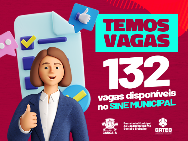 são algumas das vagas disponíveis. Para se candidatar, basta procurar o SINE Caucaia, localizado no prédio do Centro de Apoio ao Trabalho, Empreendedorismo e Qualificação (CATEQ), na rua 15 de novembro, 1478 – no Centro, das 08h às 16h.