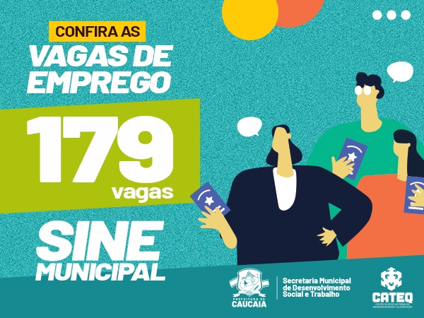 O SINE Municipal de Caucaia inicia a semana com 179 novas vagas de emprego. ajudante de cozinha, Analista de PCP (programação e controle da produção, auxiliar administrativo, auxiliar de cozinha e auxiliar administrativo (PCD) são algumas das vagas. Para se candidatar, basta procurar o SINE Caucaia, localizado no prédio do Centro de Apoio ao Trabalho, Empreendedorismo e Qualificação (CATEQ), na rua 15 de novembro, 1478 – no Centro, das 08h às 16h.