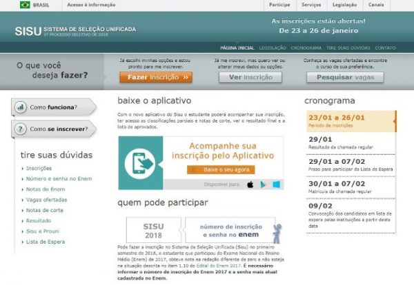 As inscrições para a edição do primeiro semestre de 2018 do Sistema de Seleção Unificada (Sisu) começaram na madrugada desta terça-feira (23). Segundo o Ministério da Educação, os candidatos que participaram da edição 2017 do Exame Nacional do Ensino Médio (Enem) poderão concorrer a 239.601 vagas de 130 instituições públicas de ensino superior federais e estaduais (universidades, institutos, centros universitários, faculdades e centros de educação tecnológica).