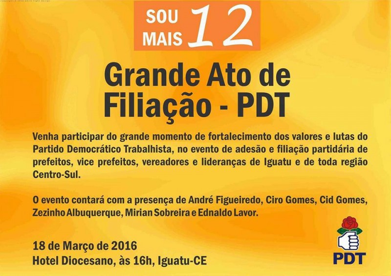 O Partido Democrático Trabalhista (PDT) realiza nesta sexta-feira- (18), no hotel Diocesano, às 16hs, um ato de filiação e adesão de lideranças políticas e de correligionários da região.