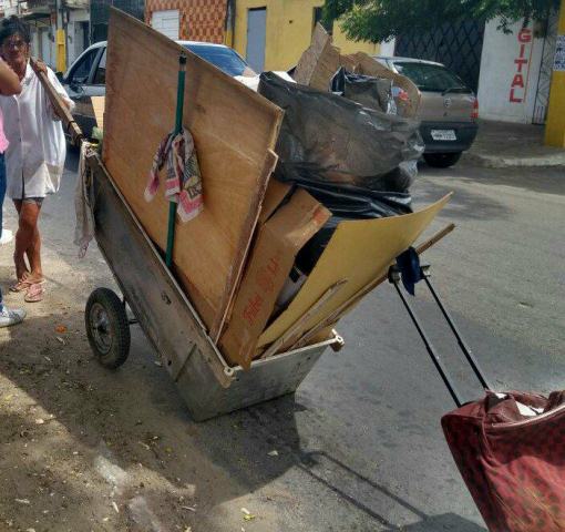 Cada dia de trabalho emburrando um carrinho pelas ruas pelos bairros Araturi e Metrópole basicamente na Avenida São Vicente de Paula, segundo ela são de três a quatro viagens por dia , enchendo o carrinho ate o deposito para vender os matérias recicláveis. Impressionante como à senhora franzina consegue manobrar tanta resistência.